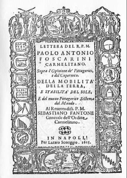 P. A. FOSCARINI, Lettera del R.P.M. Paolo Antonio Foscarini carmelitano. Sopra l'opinione de' Pittagorici, e del Copernico. Della mobilita' della terra, e stabilita' del sole, e del nuouo pittagorico sistema del mondo, Napoli 1615.